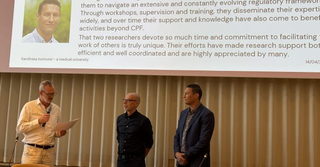 Thomas Parling och Samir El Alaoui, som leder FoU-samordningen på CPF, fick pris för sitt stora engagemang i att under sex år bygga upp ett stabilt och heltäckande forskningsstöd för studier inom Region Stockholm och Karolinska Institutet. Med mottot ”det ska vara lätt att göra rätt” guidar de forskare genom hela processen – från etikprövning och datahantering till avtal och arkivering. De har även etablerat samarbeten med jurister, arkivarier och data management-specialister samt skapat dialog mellan KI och SLSO. Genom utbildningar, handledning och workshoppar sprider de sin expertis brett, och arbetet har kommit till nytta även utanför CPF.